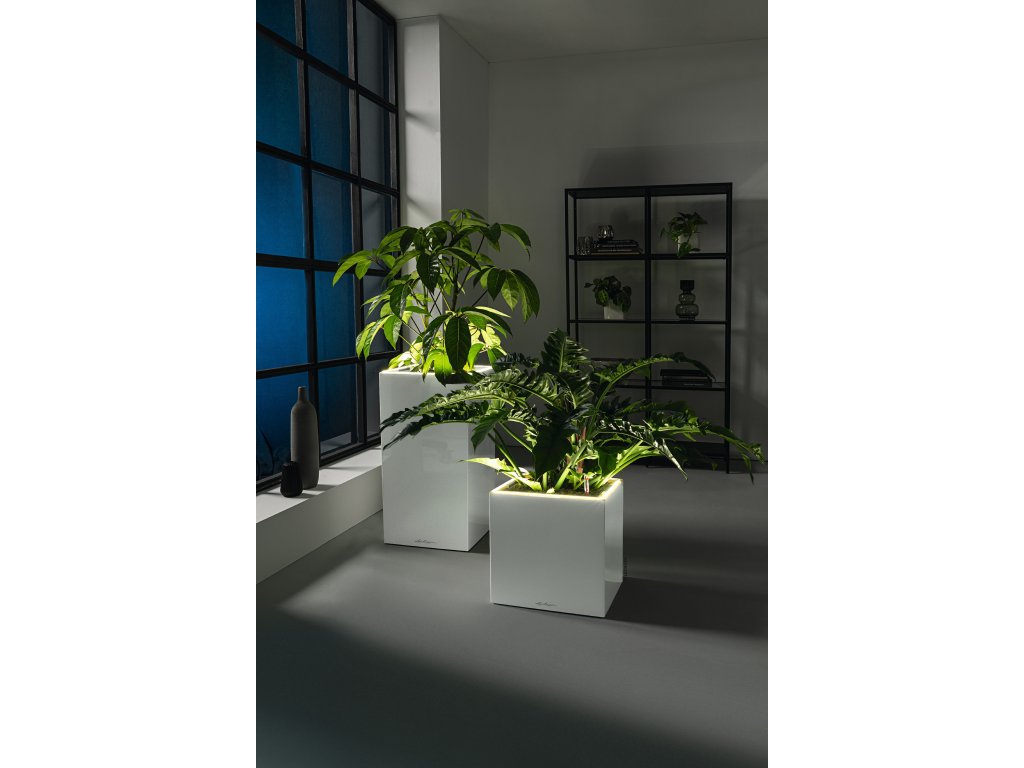 Samozavlažovací květináče Lechuza Canto Premium kostka LED stříbrná se vyrábějí s povrchovou úpravu metalického laku. V rámu vyjímatelné vložky je umístěn světelný LED pásek s 3 m dlouhým napájecím kabelem do zásuvky. Komplet je včetně dálkového ovládání umožňujícího regulaci intenzity světla. Vyrábějí se ve třech barvách a vzhledem ke svému tvaru krychle jsou vhodné pro rostliny s velkým kořenovým systémem. Použití je doporučeno zejména v interiéru nebo v krytých venkovních prostorách. Komplet obsahuje květináč, vyjímatelnou sázecí vložku a samozavlažovací set se sáčkem Lechuza PON na drenážní vrstvu. Je možno dokoupit pojezdová kolečka usnadňující manipulaci s osázeným květináčem.
