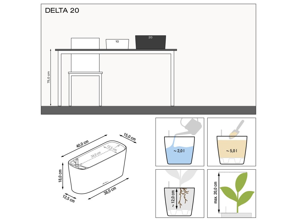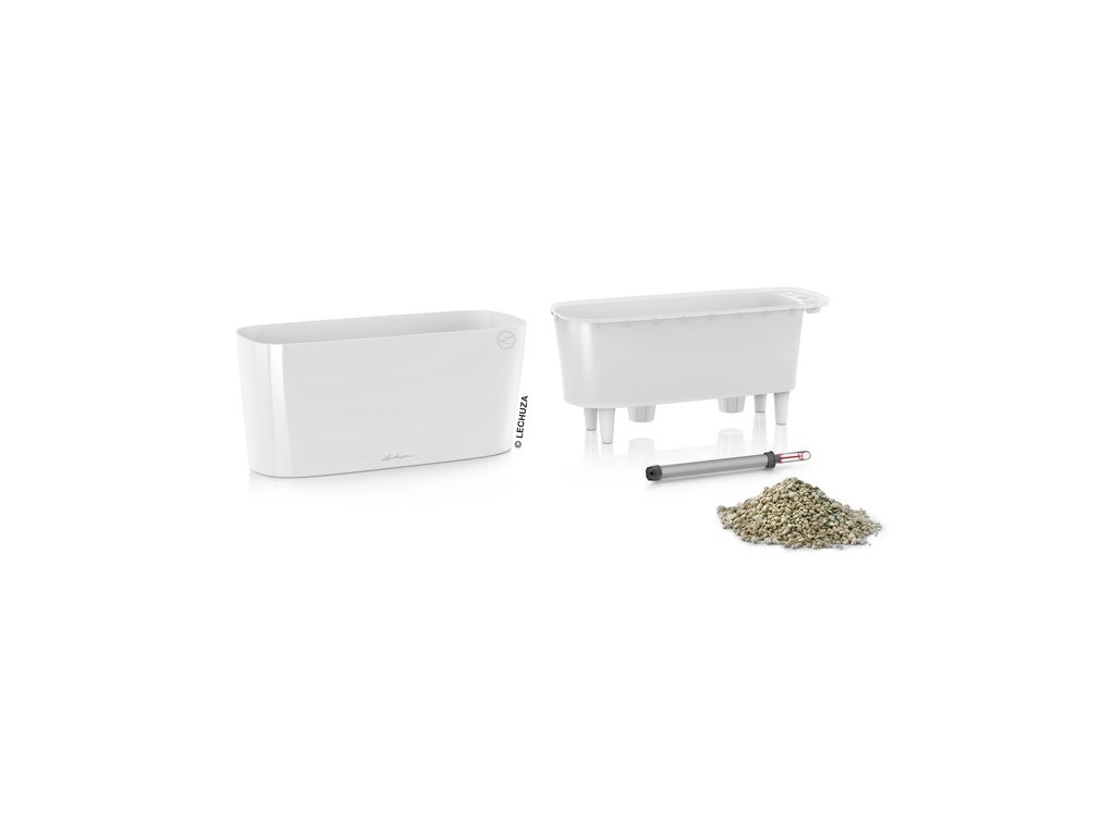 Samozavlažovací květináč Lechuza Delta 20 bílá mat má lakovaný povrch s matným lakem. Má tvar menšího truhlíku a vzhledem k jeho velikosti je ideální pro umístění na stoly, parapety či poličky. Vzhledem k tomu, že nemá zabudovaný přepad a vypouštěcí ventil, není možné jej použít ve venkovním prostředí, kde by do něj mohlo napršet - přebytečná dešťová vody by neměla jak odtéct. Komplet obsahuje květináč a samozavlažovací set zahrnující vyjímatelnou sázecí vložku v barvě obalu, měrku na vodu a sáček Lechuza PON na drenážní vrstvu. Ideální pro pěstování menších druhů orchidejí či jiných menších druhů rostlin.