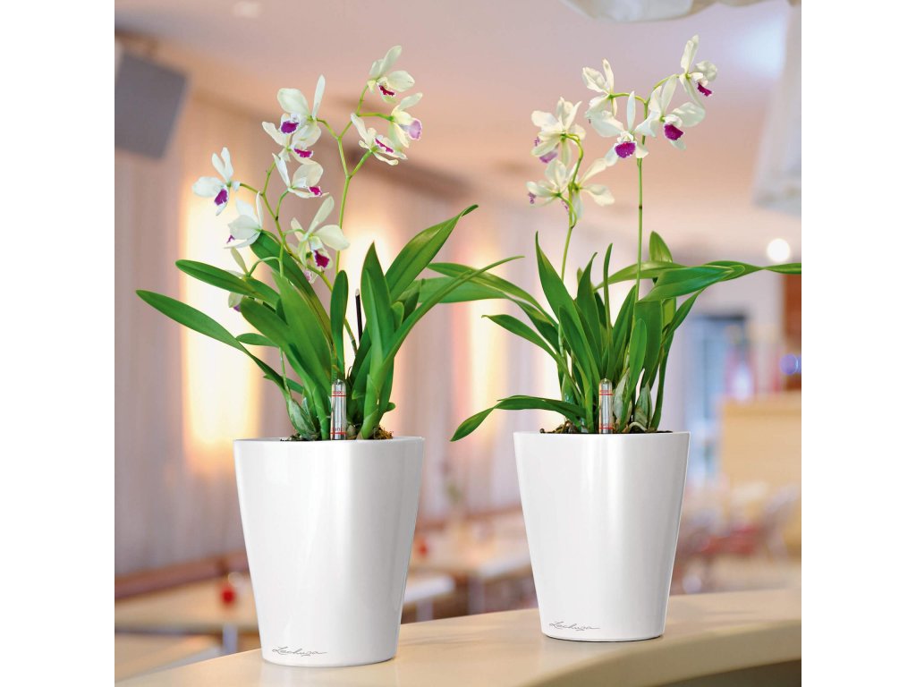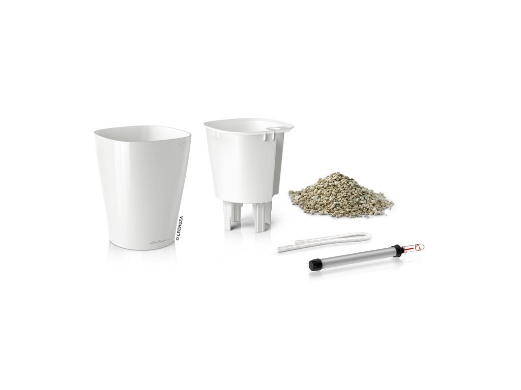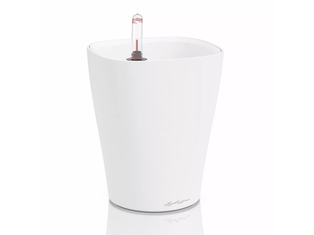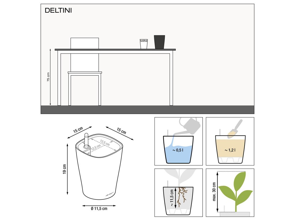 Samozavlažovací květináč Lechuza Deltini bílá mat má lakovaný povrch s matným lakem. Vzhledem k jeho velikosti je ideální pro umístění na stoly, parapety či poličky. Vzhledem k tomu, že nemá zabudovaný přepad a vypouštěcí ventil, není možné jej použít ve venkovním prostředí, kde by do něj mohlo napršet - přebytečná dešťová vody by neměla jak odtéct. Komplet obsahuje květináč a samozavlažovací set zahrnující vyjímatelnou sázecí vložku v barvě obalu, měrku na vodu a sáček Lechuza PON postačující na kompletní zasazení rostliny bez potřeby dalšího substrátu. Ideální pro pěstování menších druhů orchidejí či jiných malých druhů rostlin.