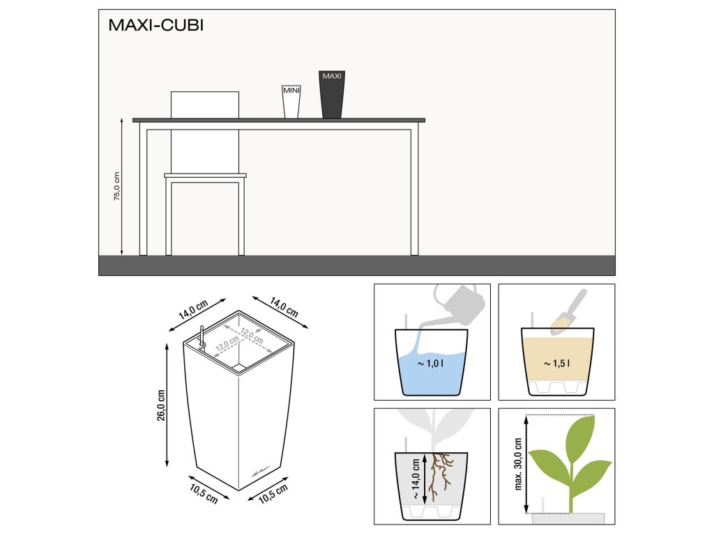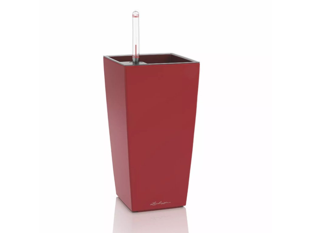 Samozavlažovací květináč Lechuza Maxi Cubi červená mat má lakovaný povrch s matným lakem. Vzhledem k jeho velikosti je ideální pro umístění na stoly, parapety či poličky. Vzhledem k tomu, že nemá zabudovaný přepad a vypouštěcí ventil, není možné jej použít ve venkovním prostředí, kde by do něj mohlo napršet - přebytečná dešťová vody by neměla jak odtéct. Komplet obsahuje květináč a samozavlažovací set zahrnující poloprůhlednou vyjímatelnou sázecí vložku, měrku na vodu a sáček Lechuza PON postačující na kompletní zasazení rostliny bez potřeby dalšího substrátu. Ideální pro pěstování menších druhů orchidejí či jiných malých druhů rostlin.