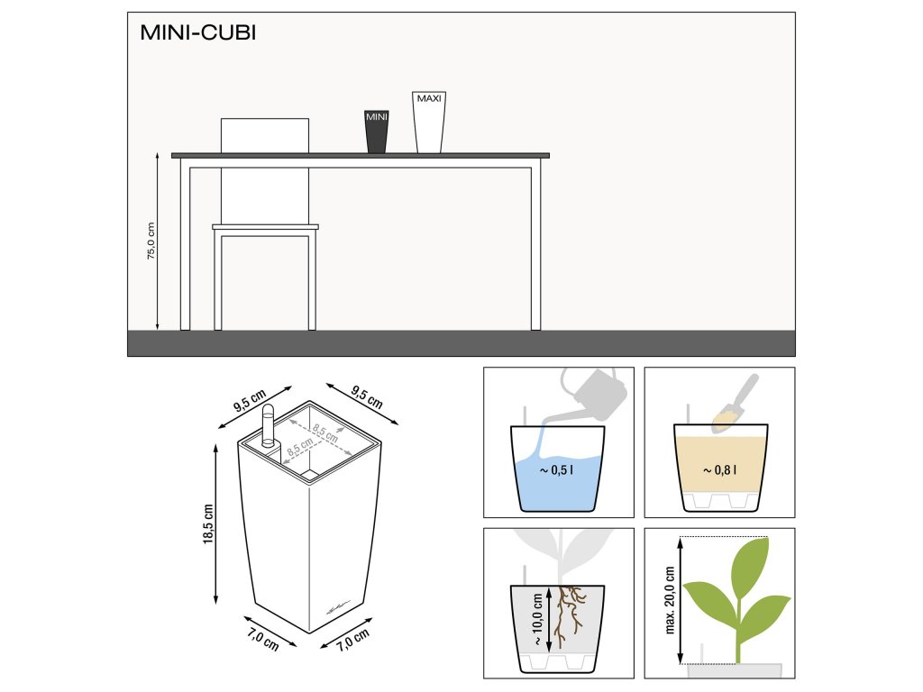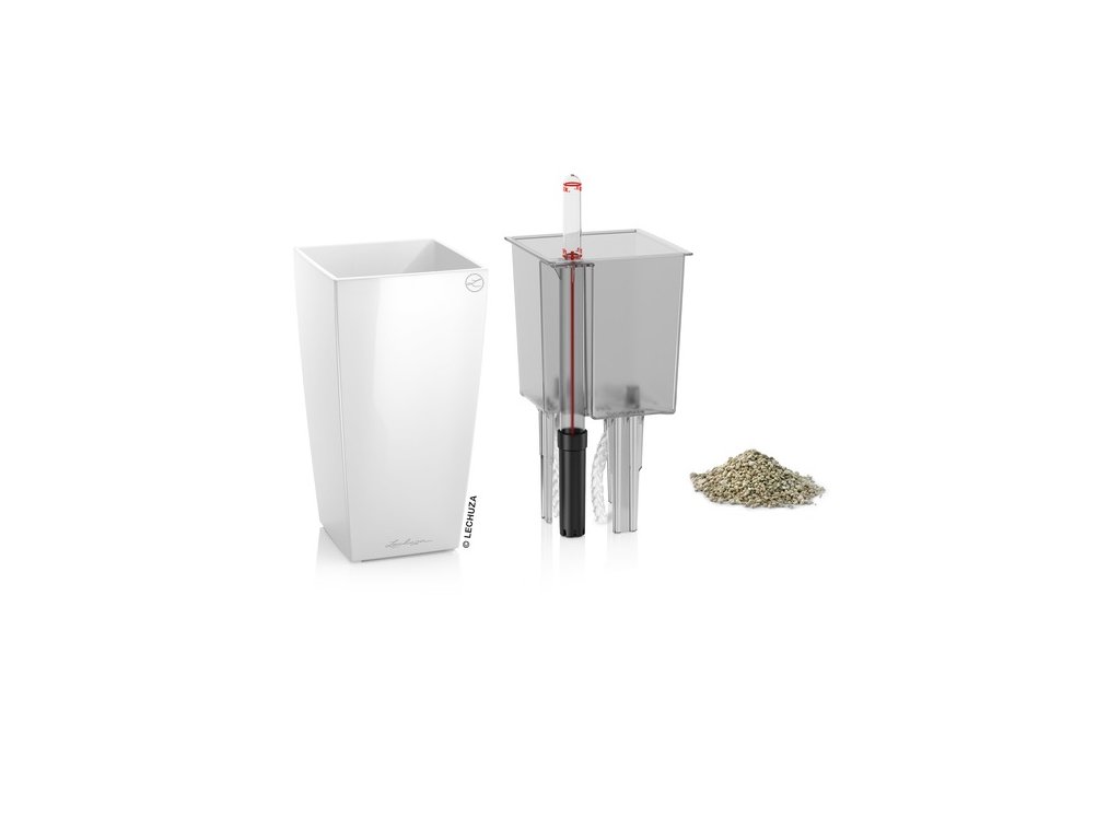 Samozavlažovací květináč Lechuza Mini Cubi bílá mat má lakovaný povrch s matným lakem. Patří k nejmenším vyráběným květináčům a vzhledem k jeho velikosti je ideální pro umístění na stoly, parapety či poličky. Vzhledem k tomu, že nemá zabudovaný přepad a vypouštěcí ventil, není možné jej použít ve venkovním prostředí, kde by do něj mohlo napršet - přebytečná dešťová vody by neměla jak odtéct. Komplet obsahuje květináč a samozavlažovací set zahrnující poloprůhlednou vyjímatelnou sázecí vložku, měrku na vodu a sáček Lechuza PON postačující na kompletní zasazení rostliny bez potřeby dalšího substrátu. Ideální pro pěstování menších druhů orchidejí či jiných malých druhů rostlin.