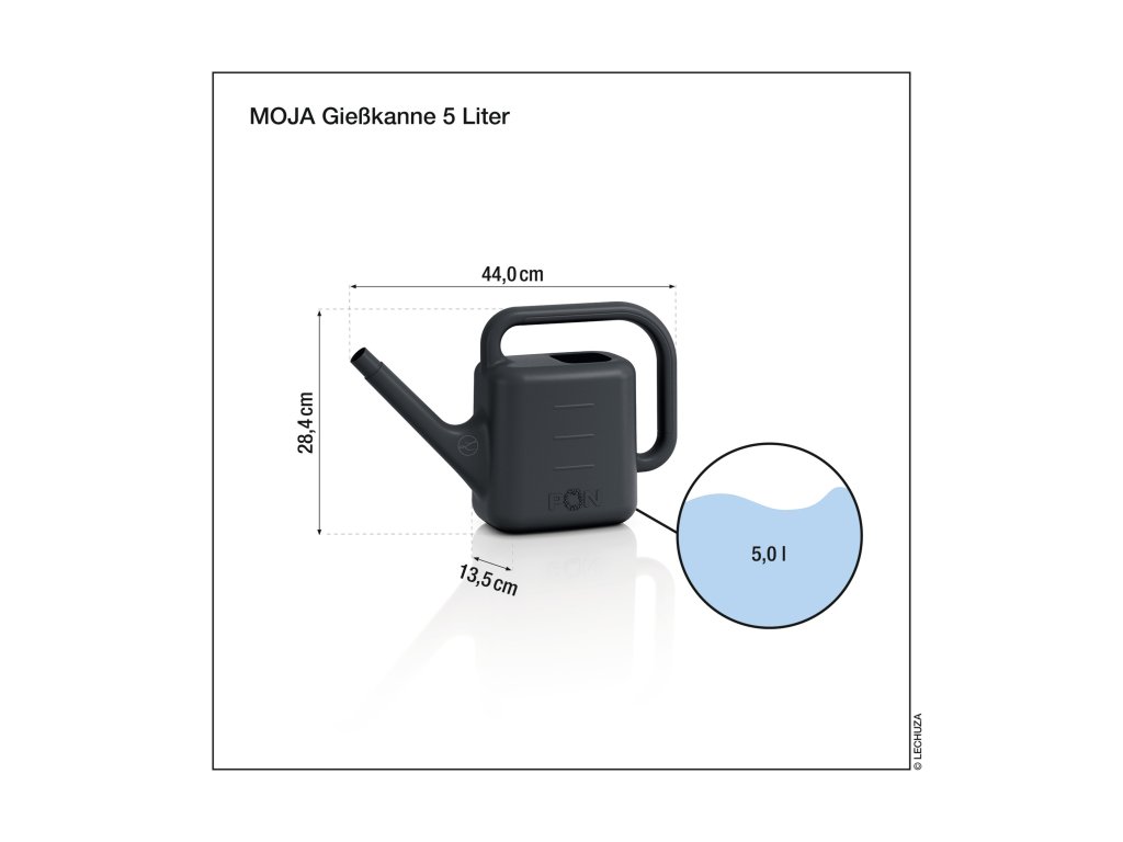 Zalévací konev Lechuza MOJA konev 10l břidlicová usnadňuje a zpříjemňuje péči o rostliny. S objemem 5 litrů tato stylová konev spolehlivě zalévá rostliny všech velikostí. Díky ergonomické rukojeti po celém obvodu pohodlně padne do ruky, i když je plná vody. Robustní, moderní design je atraktivní a poskytuje stabilní základnu. Jasně viditelný ukazatel hladiny naplnění na vnější straně vám pomůže sledovat hladinu vody. Díky svému výraznému krychlovému tvaru je konve také poutavým doplňkem každé zahrady nebo terasy. K dispozici ve třech moderních barvách, které doplní váš oblíbený zelený prostor.